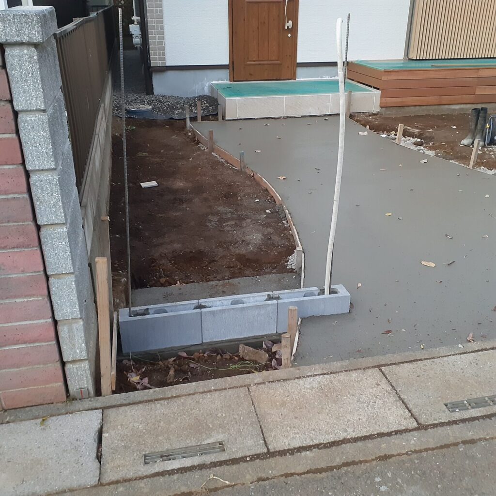 本日は建物周囲防草シート+砂利敷、石床の下地と門柱の下地を行いました。