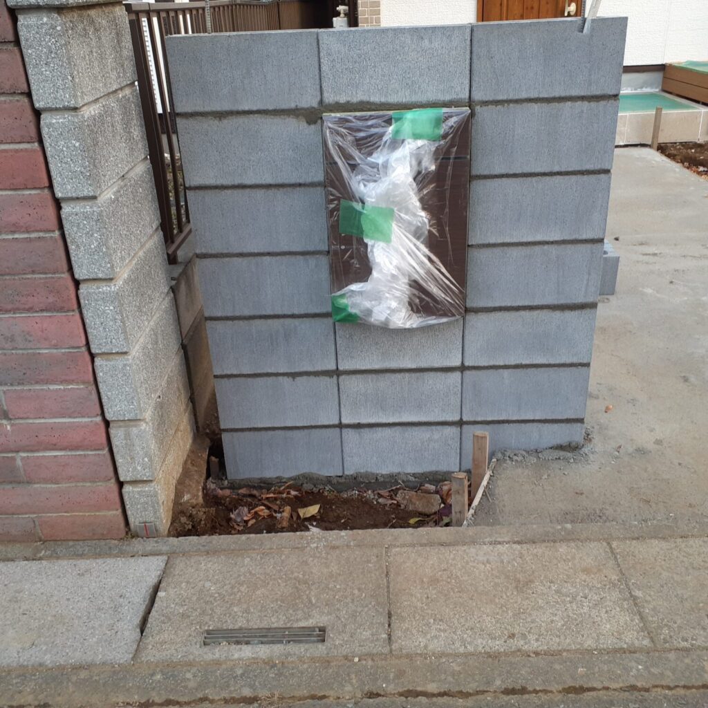 上尾市で行っている外構工事ですが、本日は門柱の下地ブロック積を行いました。