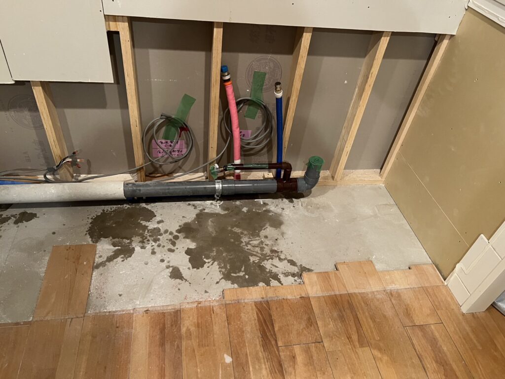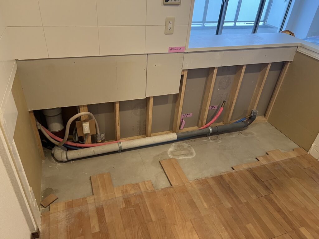 世田谷区のマンションリフォームですが、本日はキッチンの配管作業を行いました。