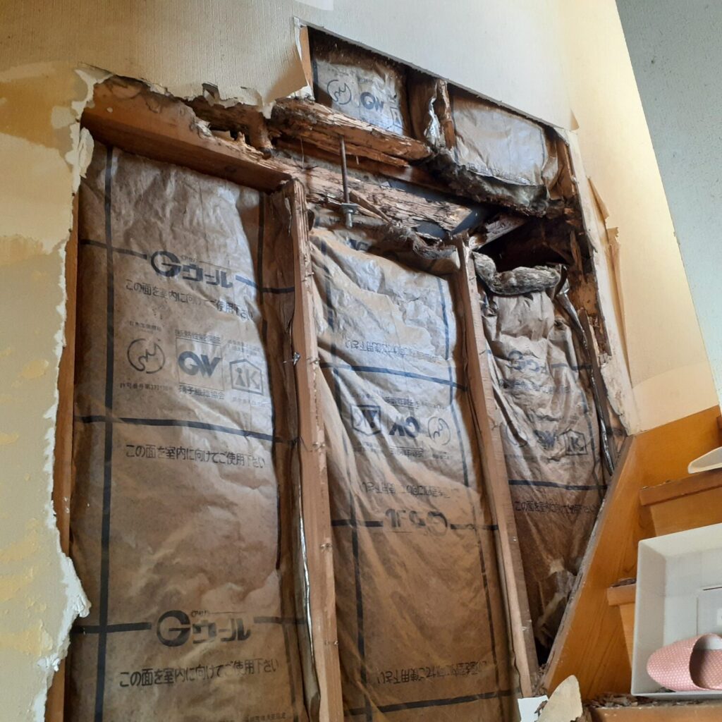 壁が湿っていたのでボードを壊してみたら、柱・梁がシロアリに食べられていました。