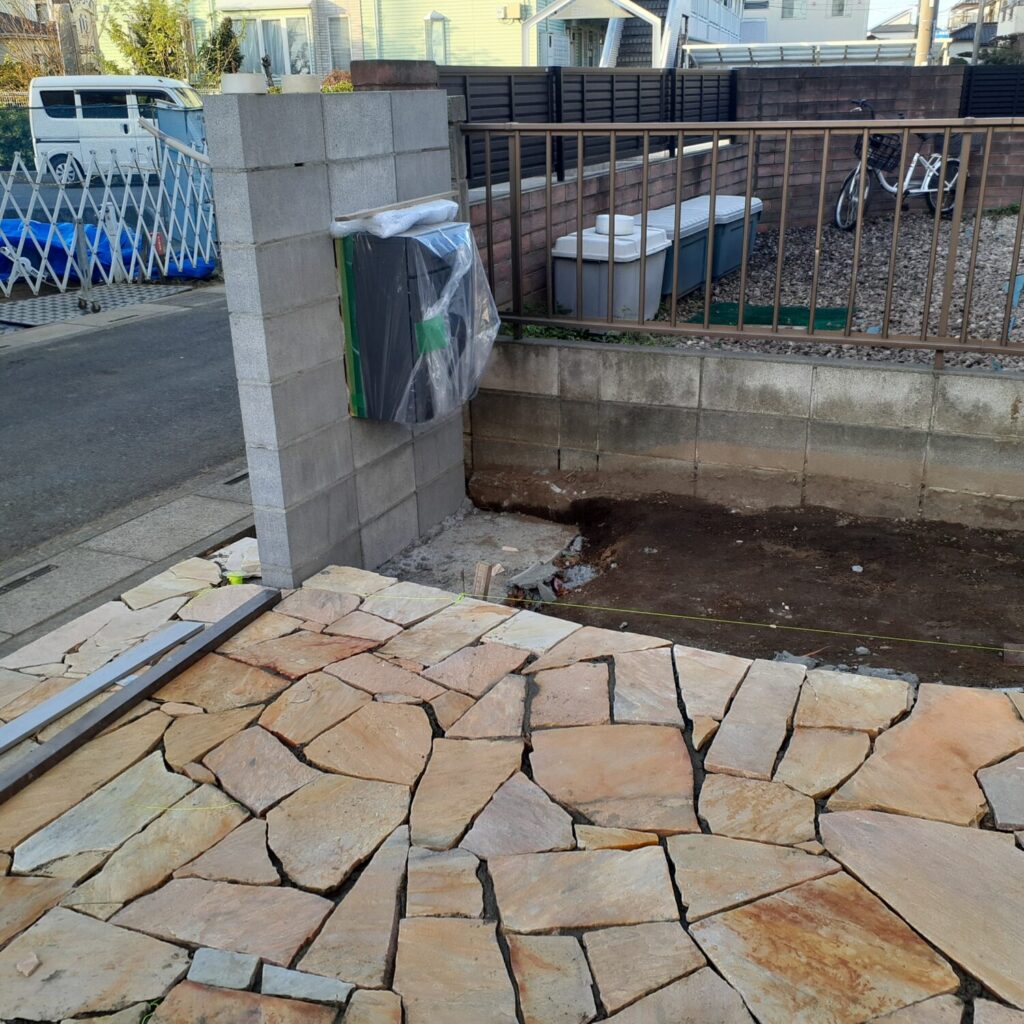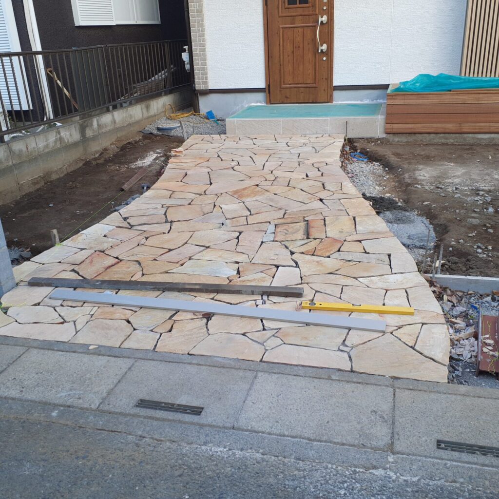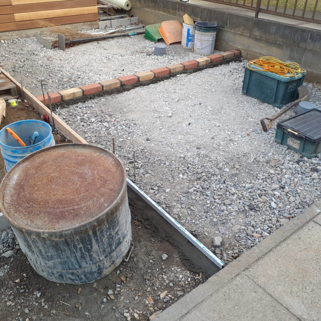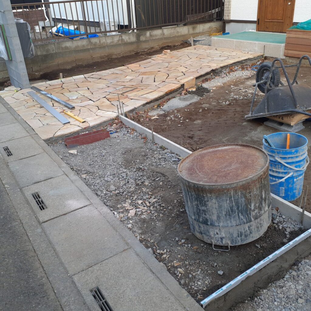 本日は天然石張り作業と土間打ち前の見切り部を施工しました。