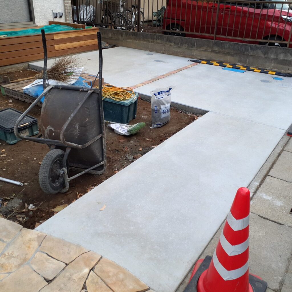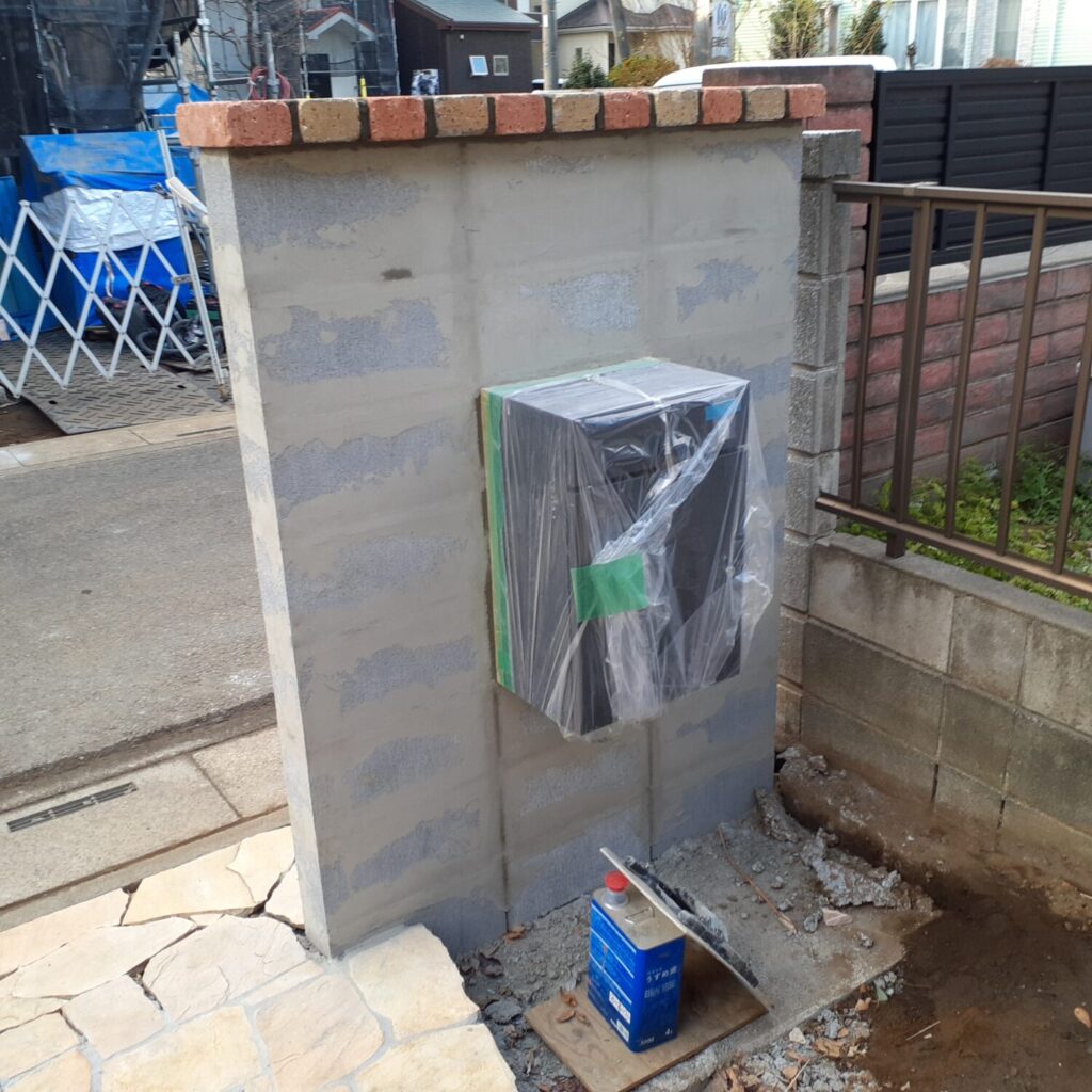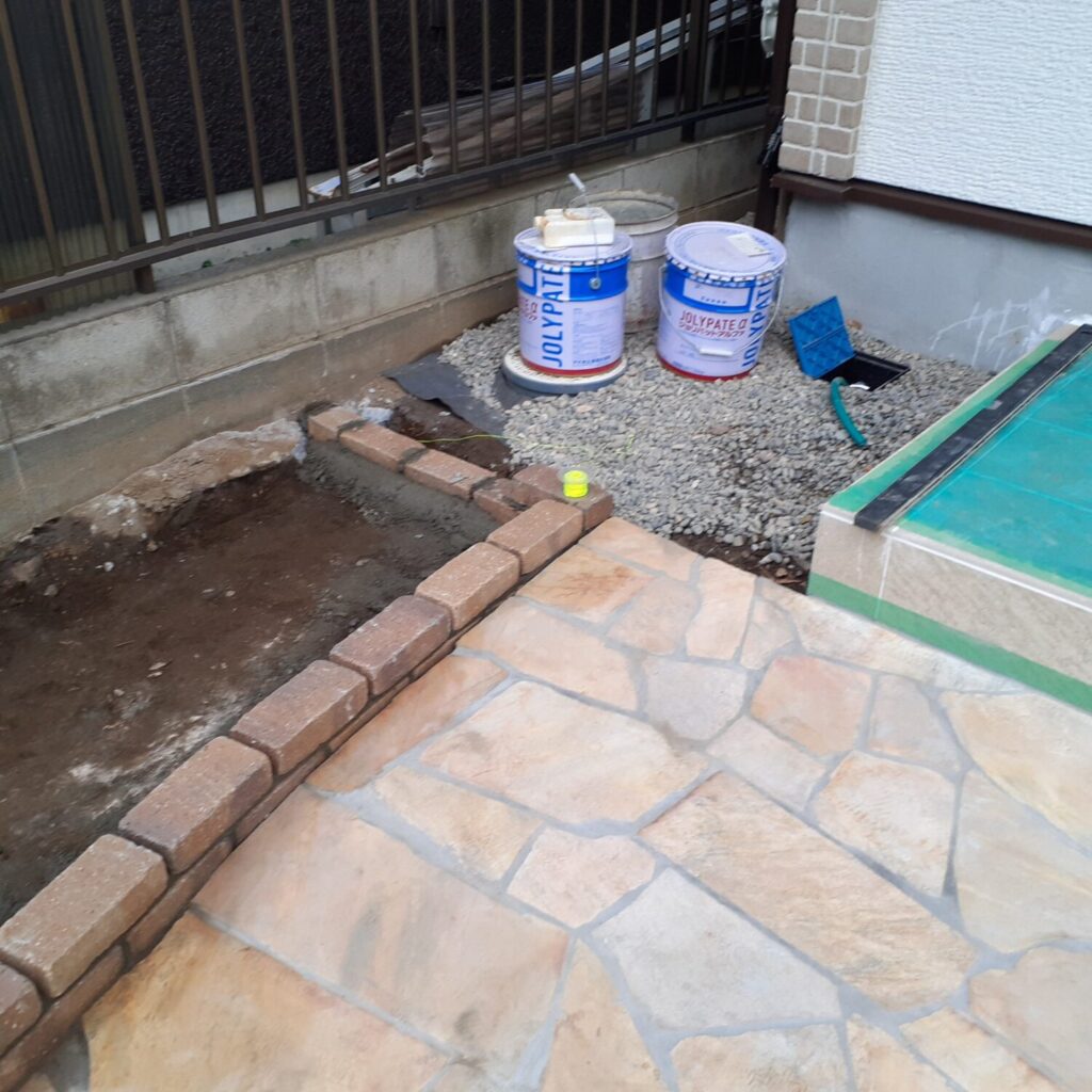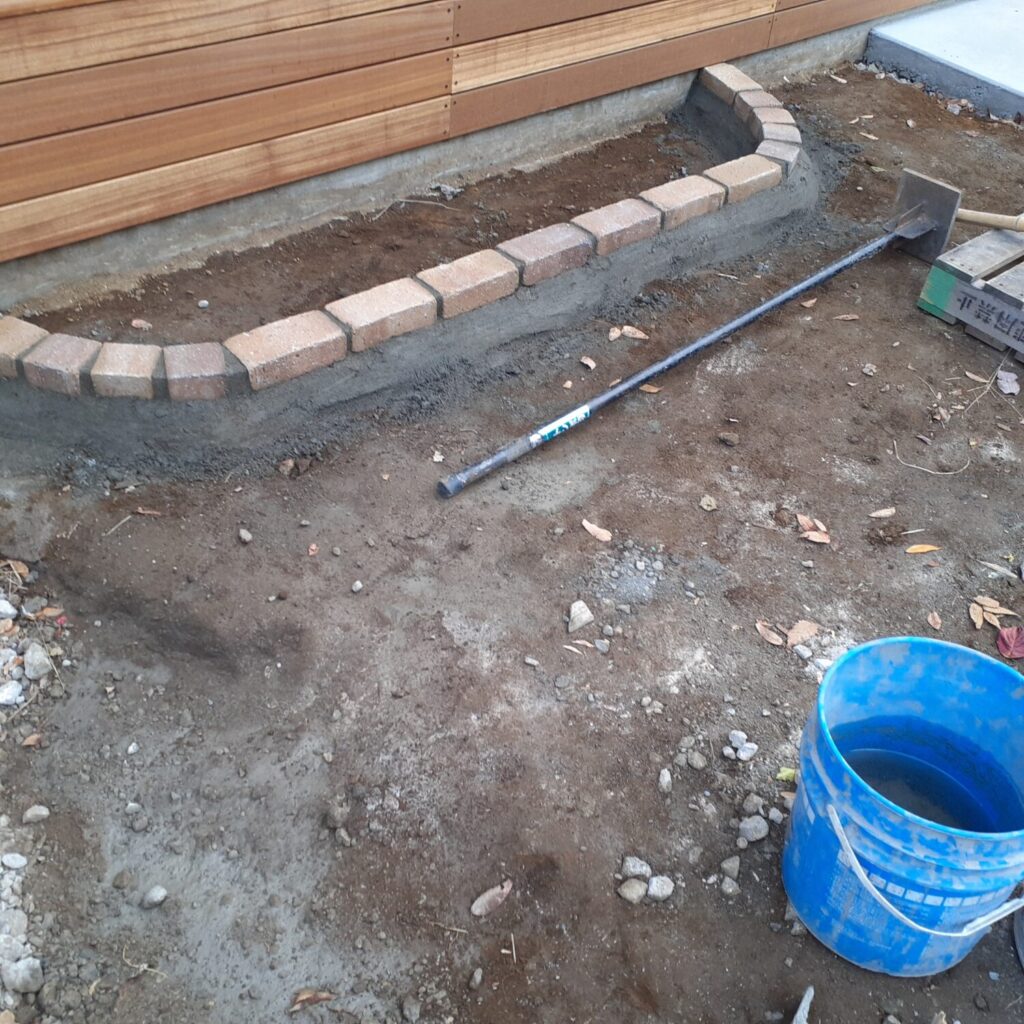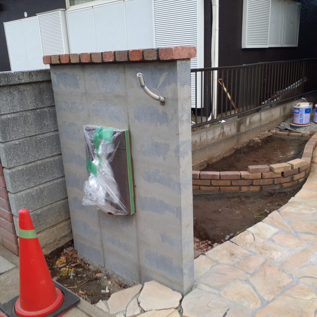 上尾市の外構工事ですが、本日は門壁下地、花壇レンガ積みを行いました。