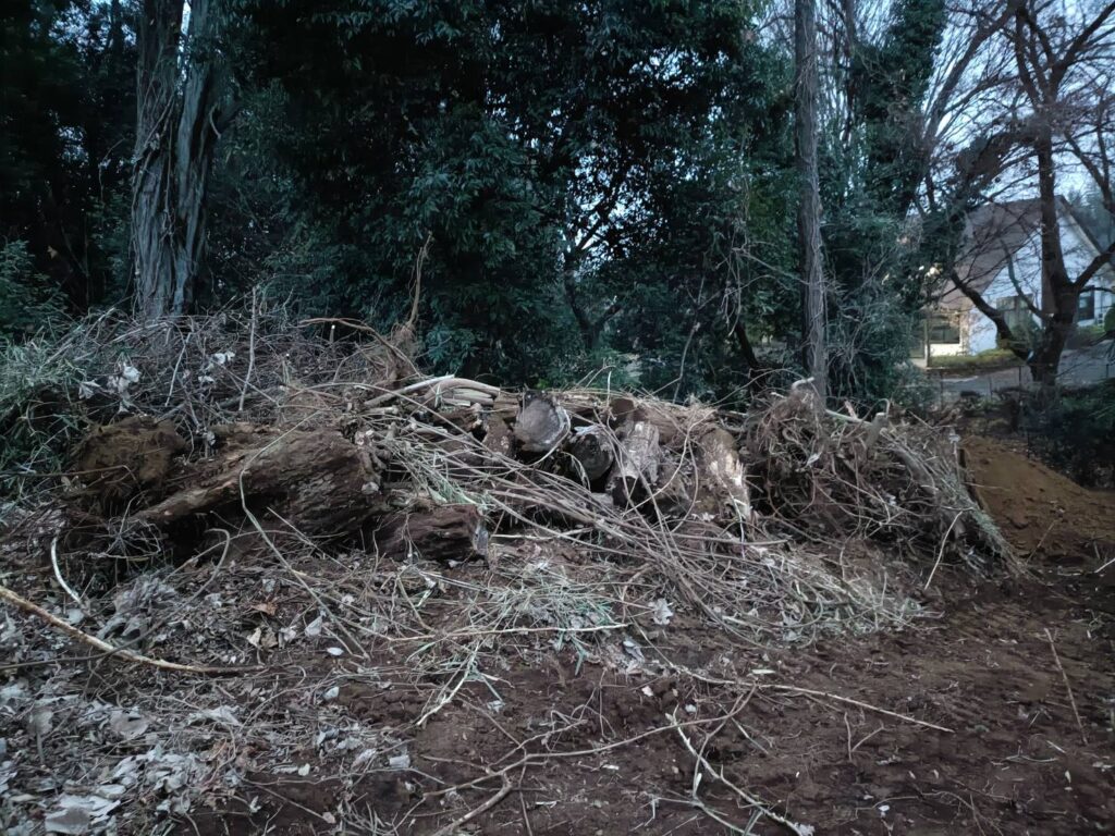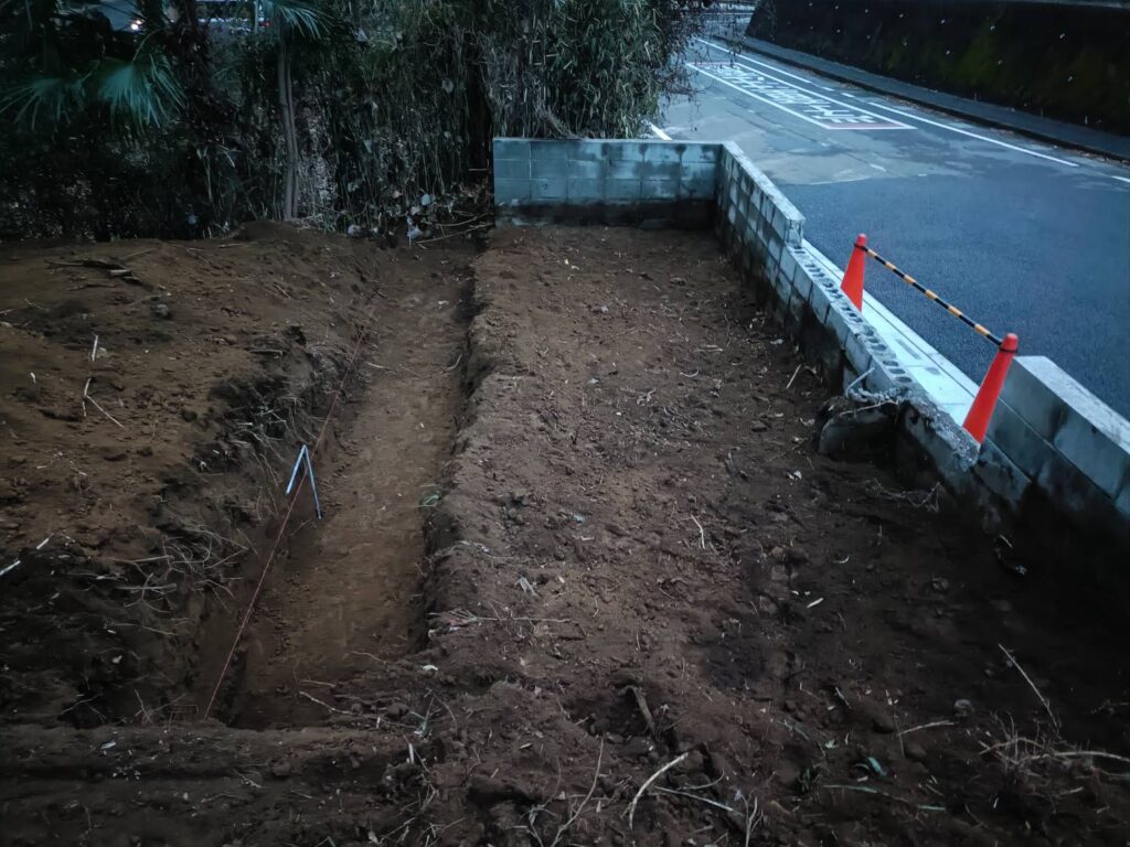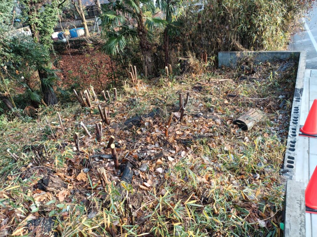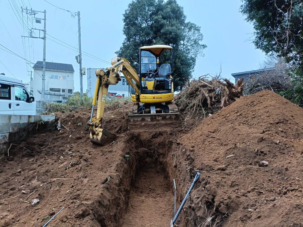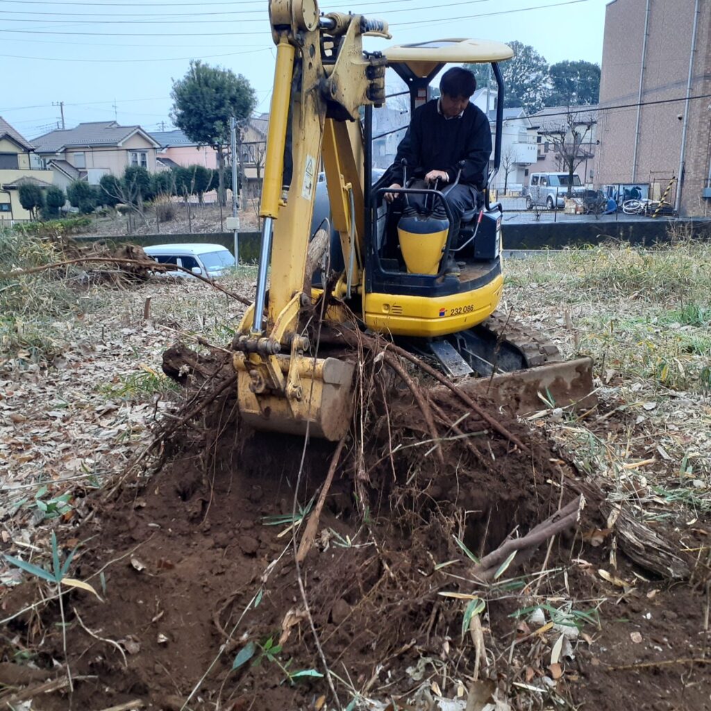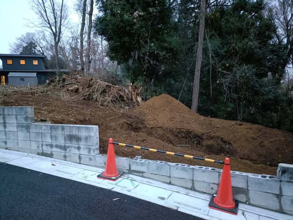 上尾市で行っています外構工事ですが、ようやく伐採作業が終了しコンクリート下地処理作業に入りました。