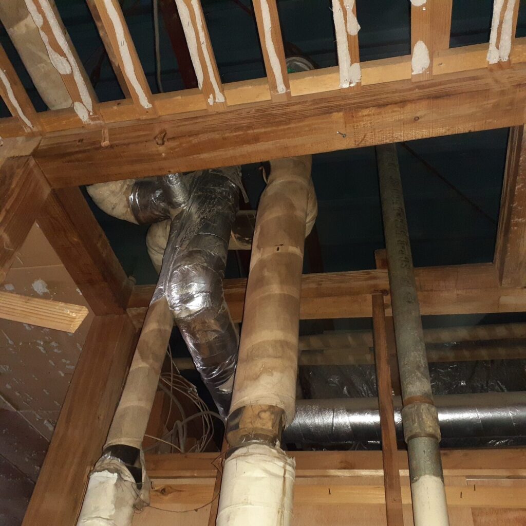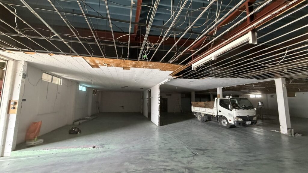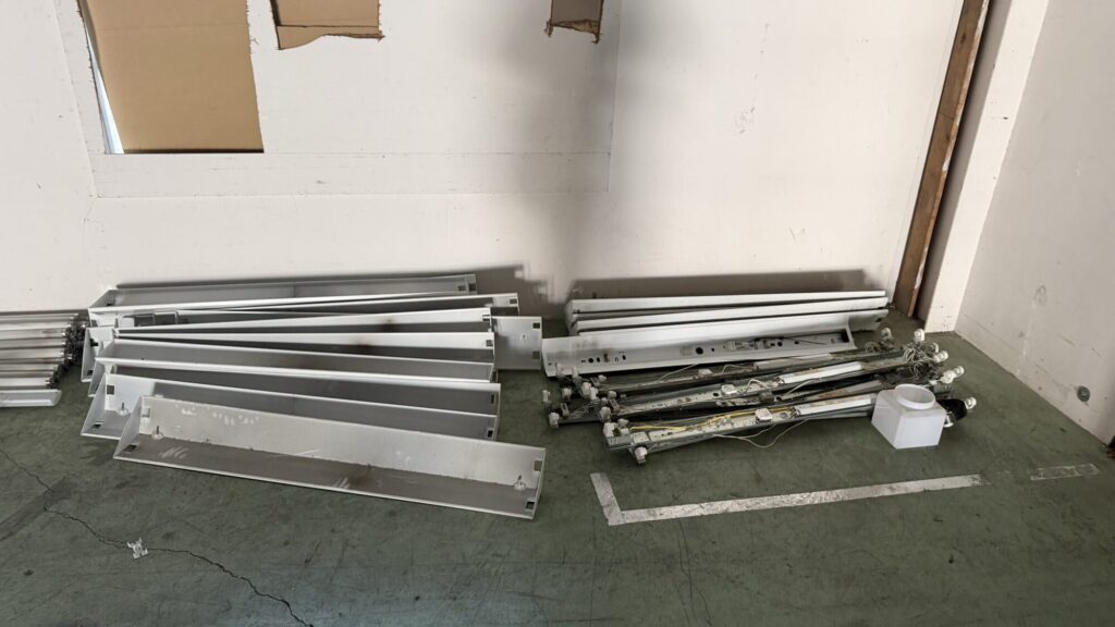 上尾市の倉庫改装工事現場では解体作業と解体に伴う配管処理、照明器具器具・消防設備交換に伴う撤去作業を行いました。