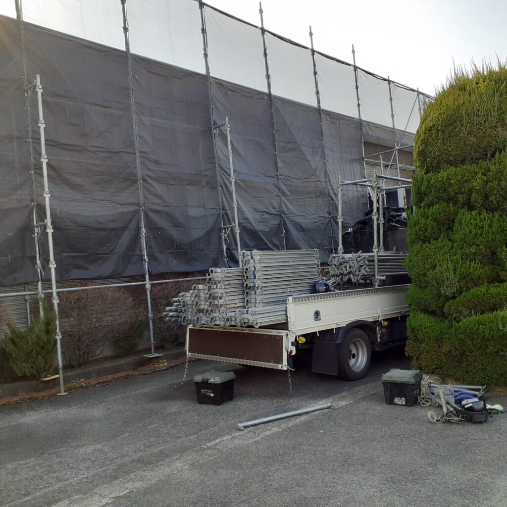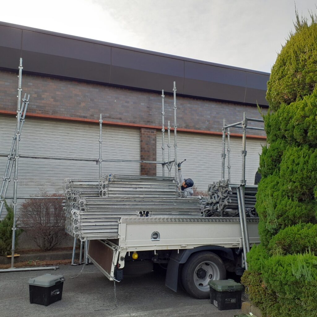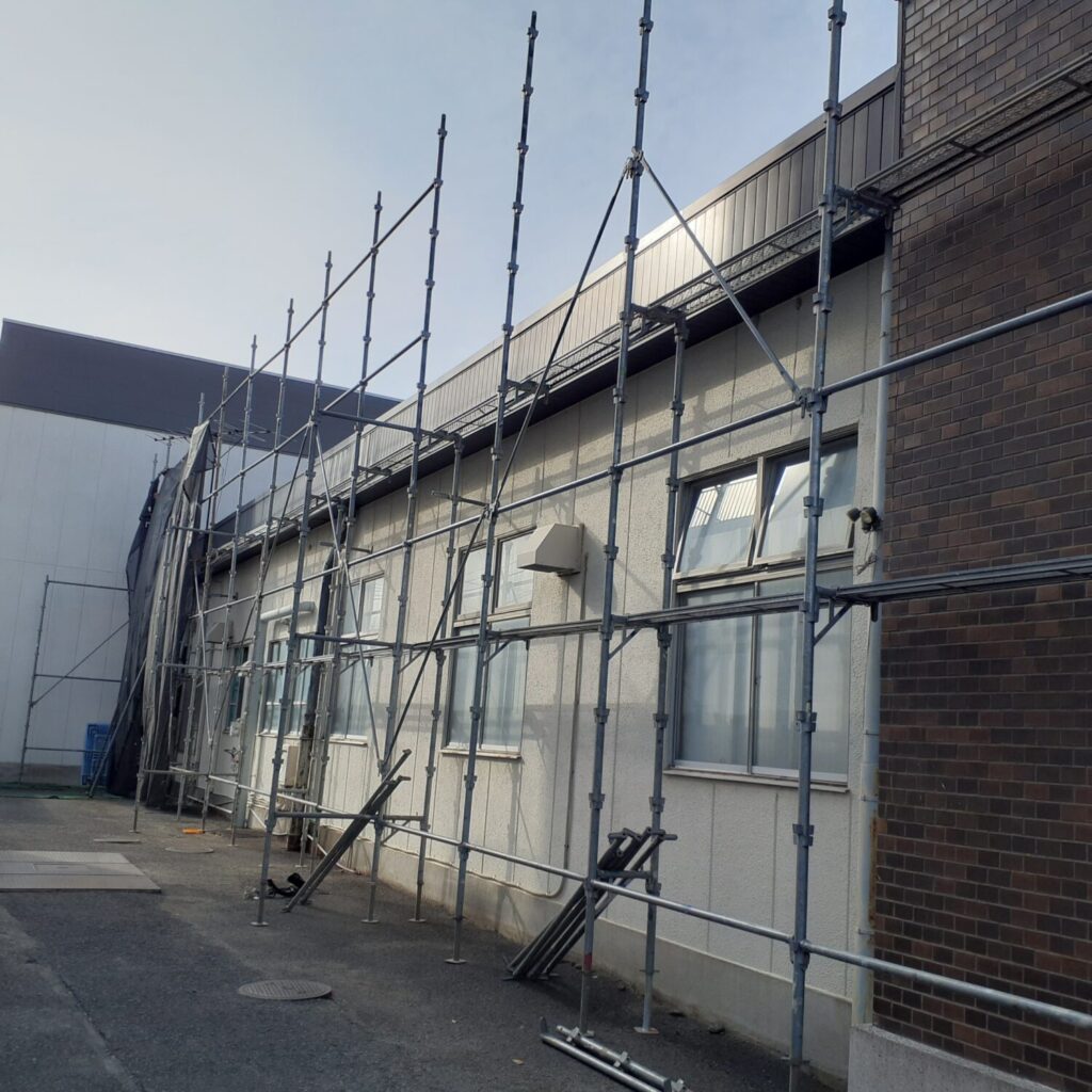 上尾市の倉庫改装現場は本日は足場を設置しました。