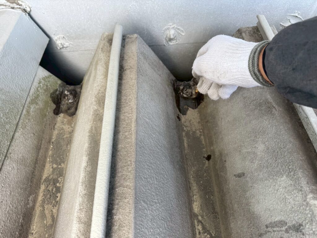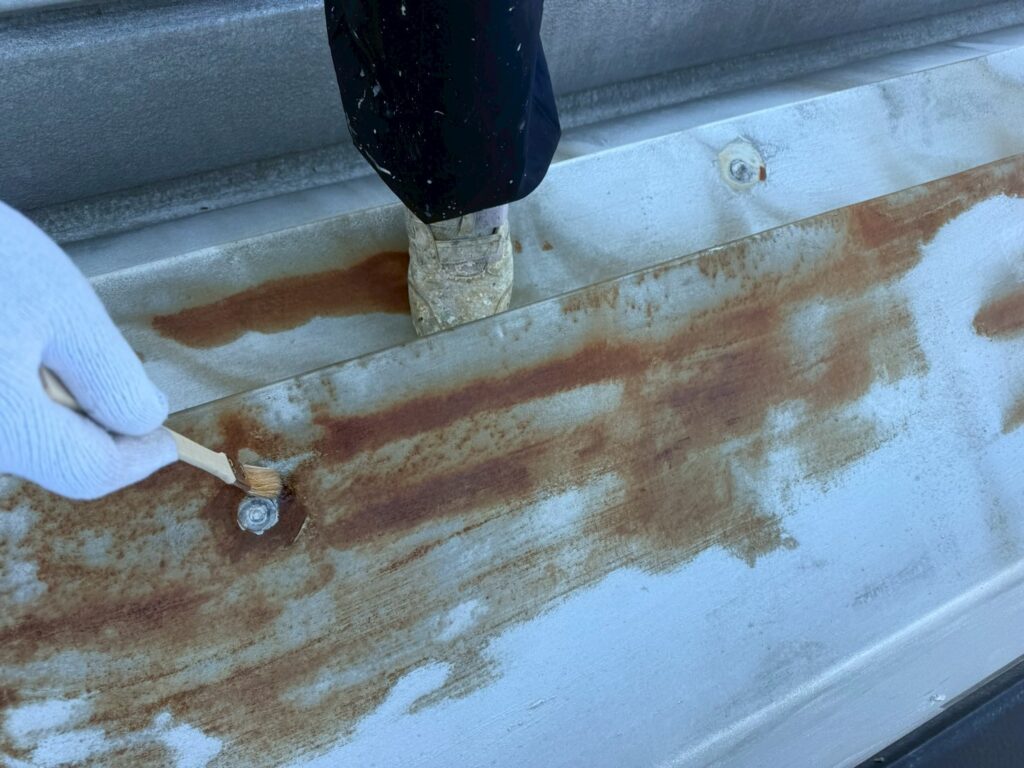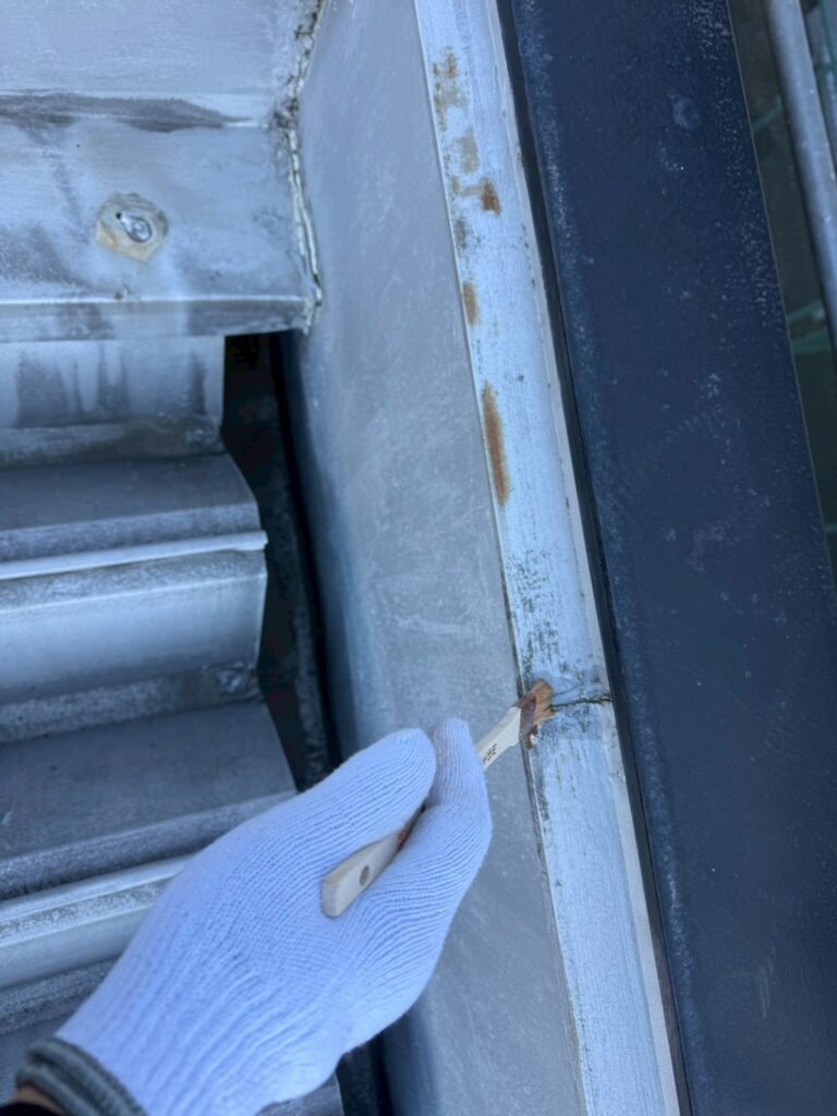 本日は上尾市で倉庫屋根の塗装前にビス周囲などのシーリング処理を行いました。
