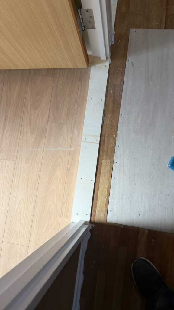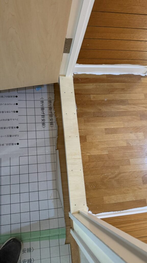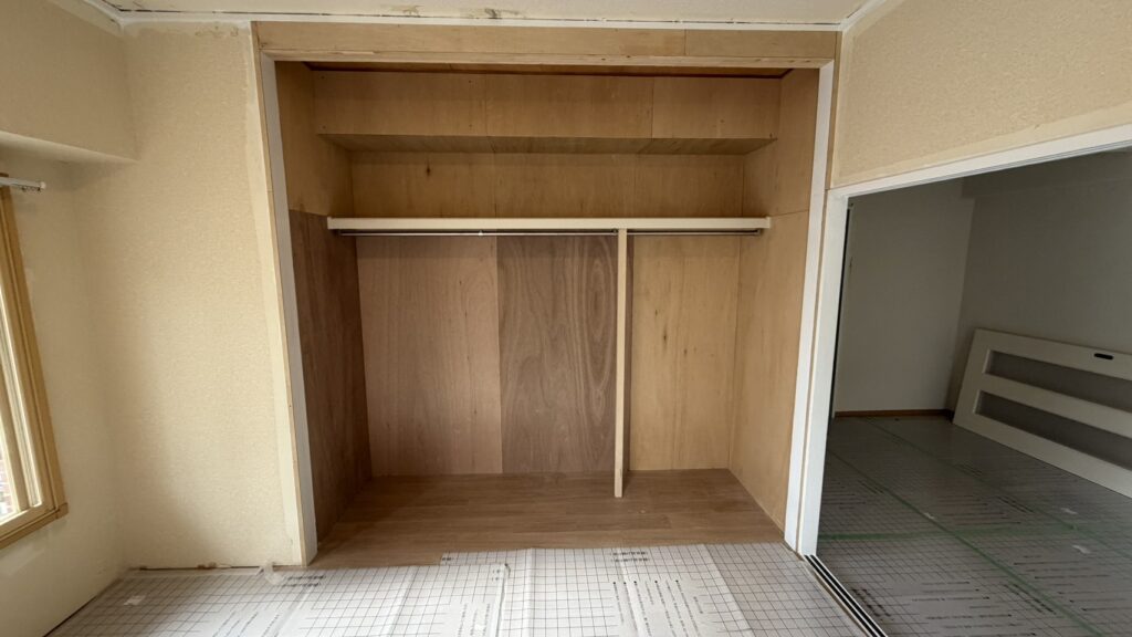 押入れ枠開口寸法直しや、ベニヤ貼り作業を行いました。