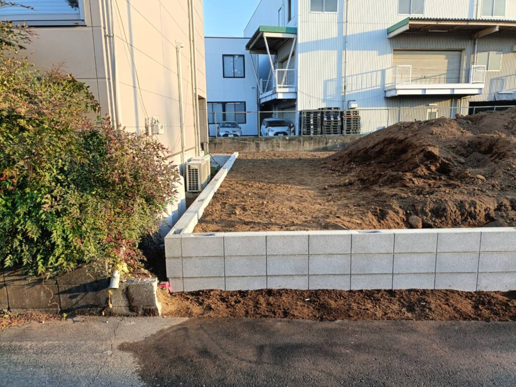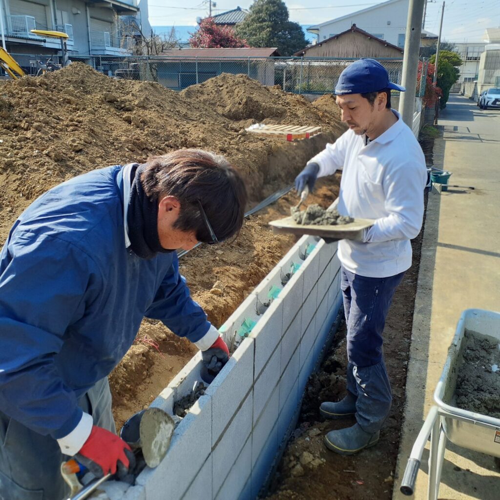 上尾市で行っております外構工事現場では、ブロックの組積作業を行いました。