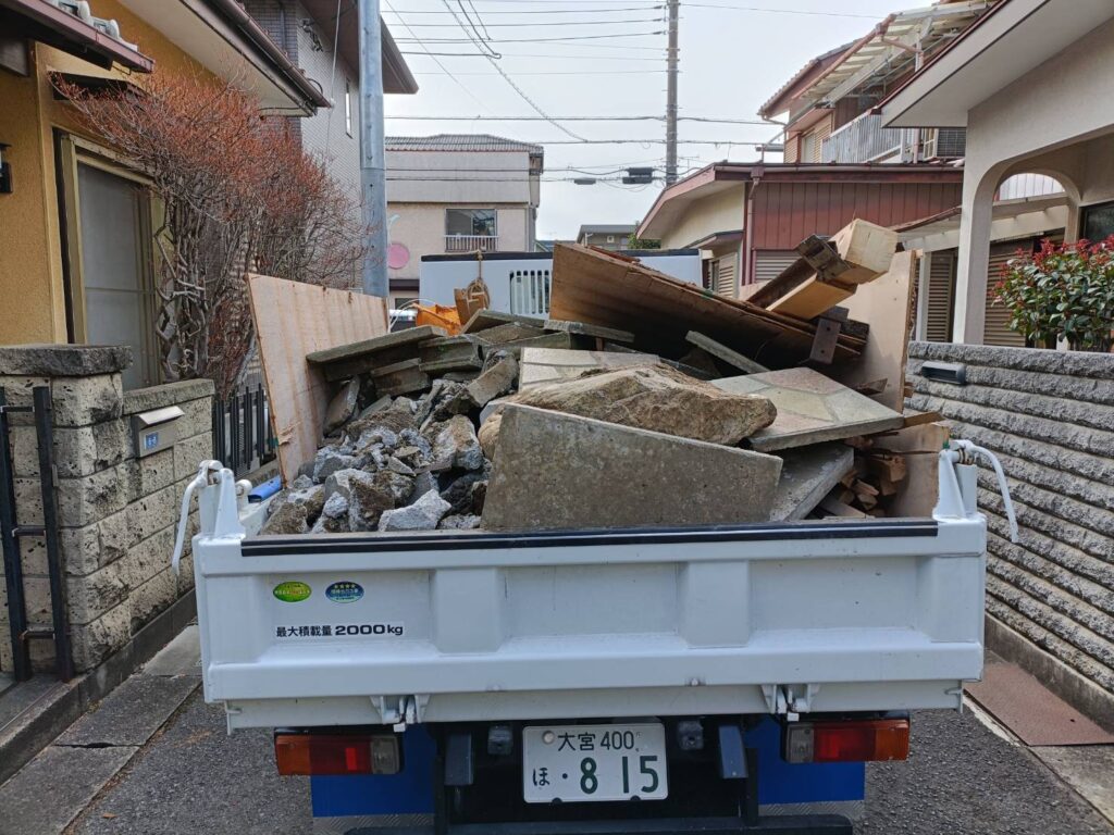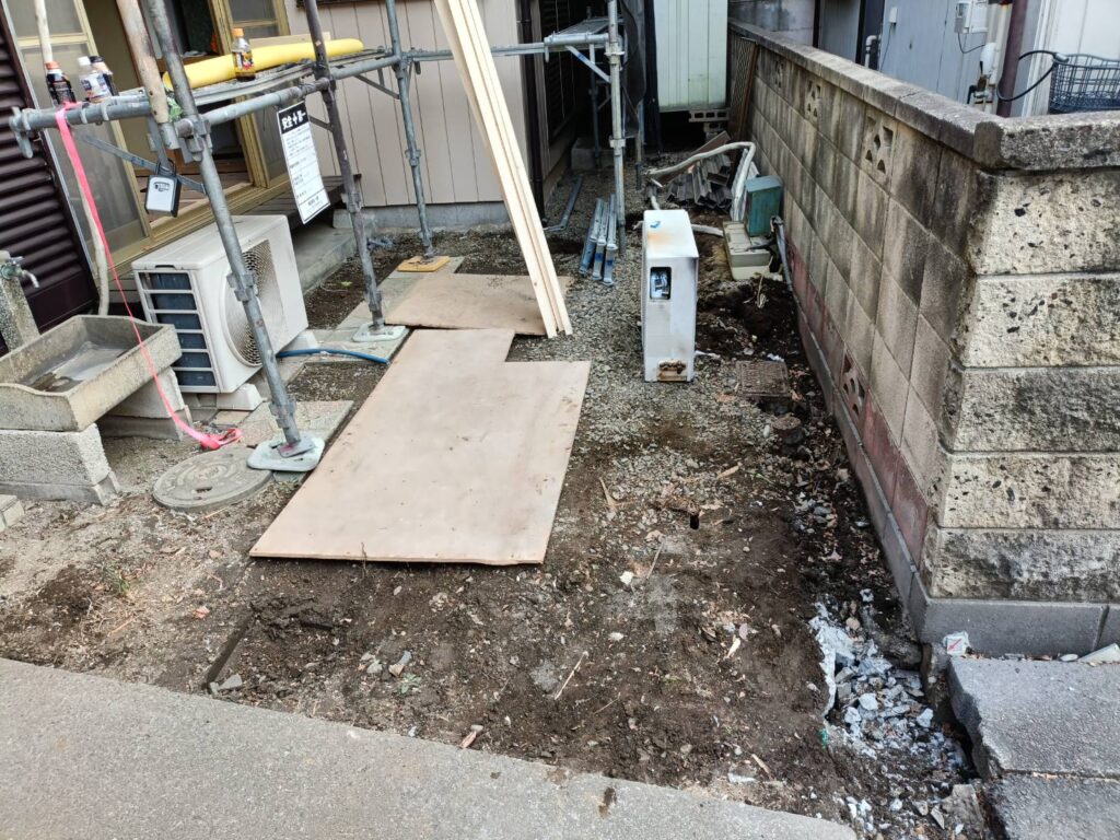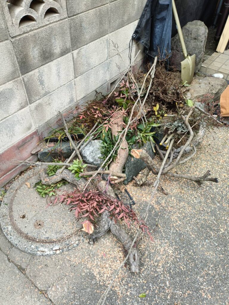桶川市の外構工事現場では、庭から車庫へ変更するため、伐採作業・敷石撤去作業を行いました。