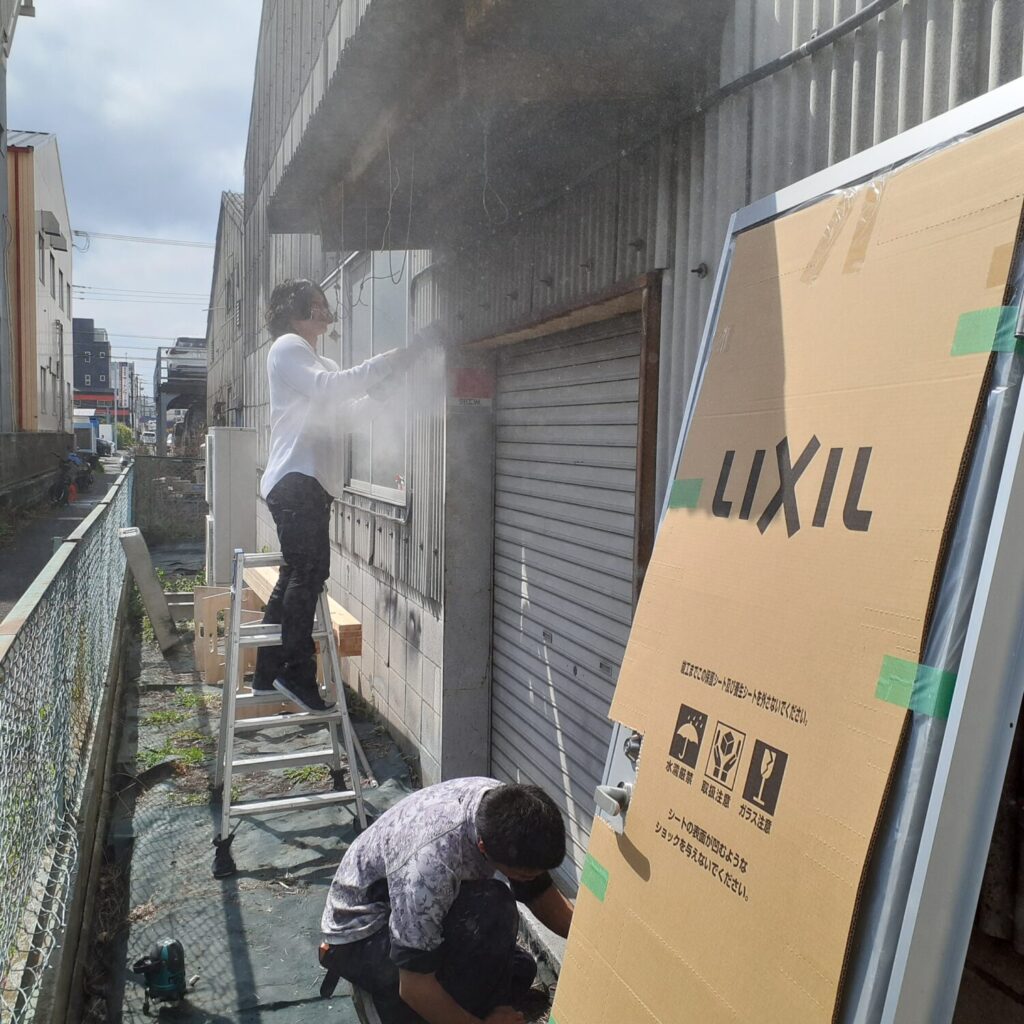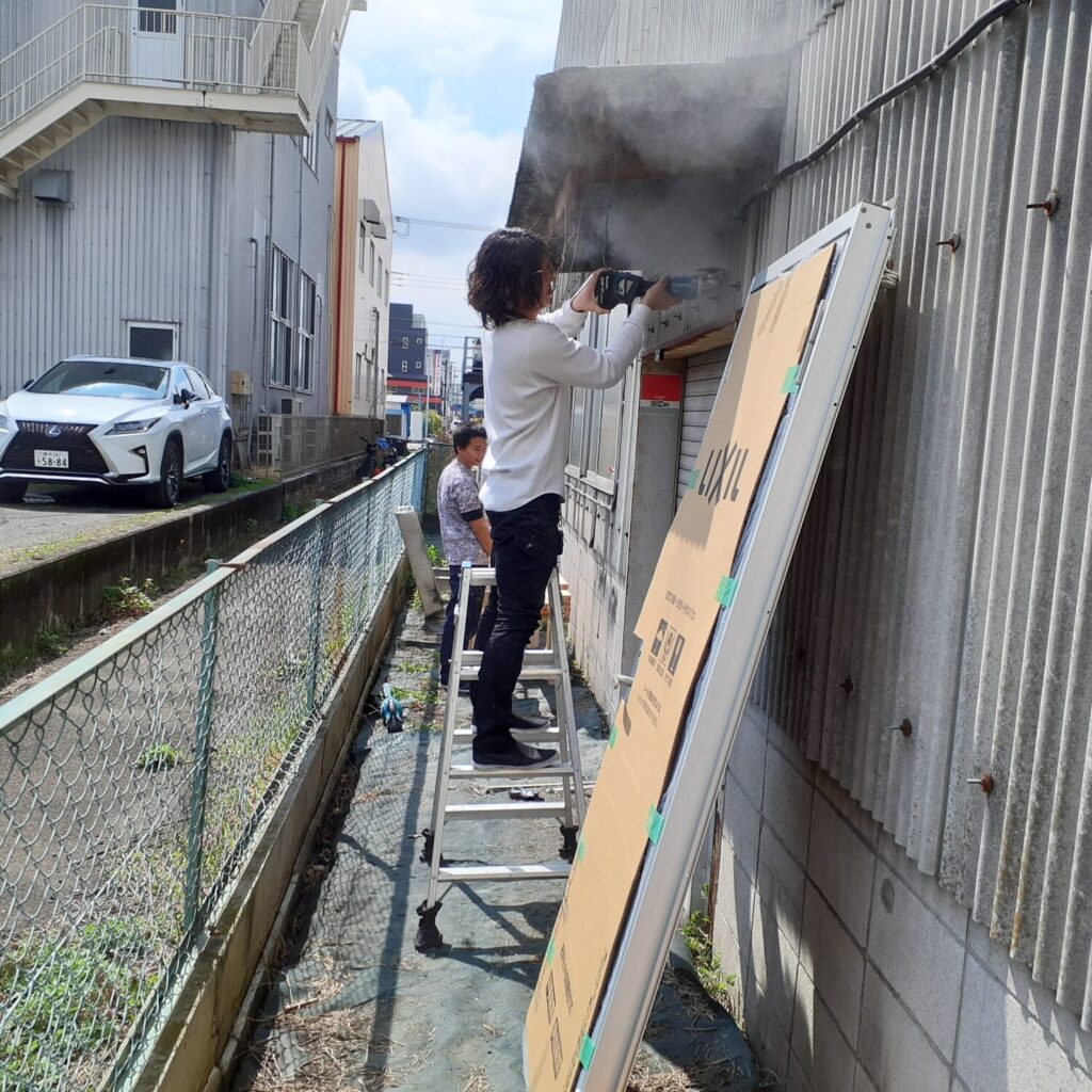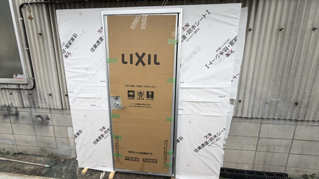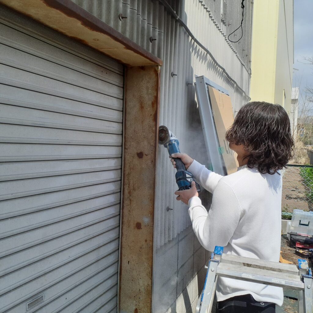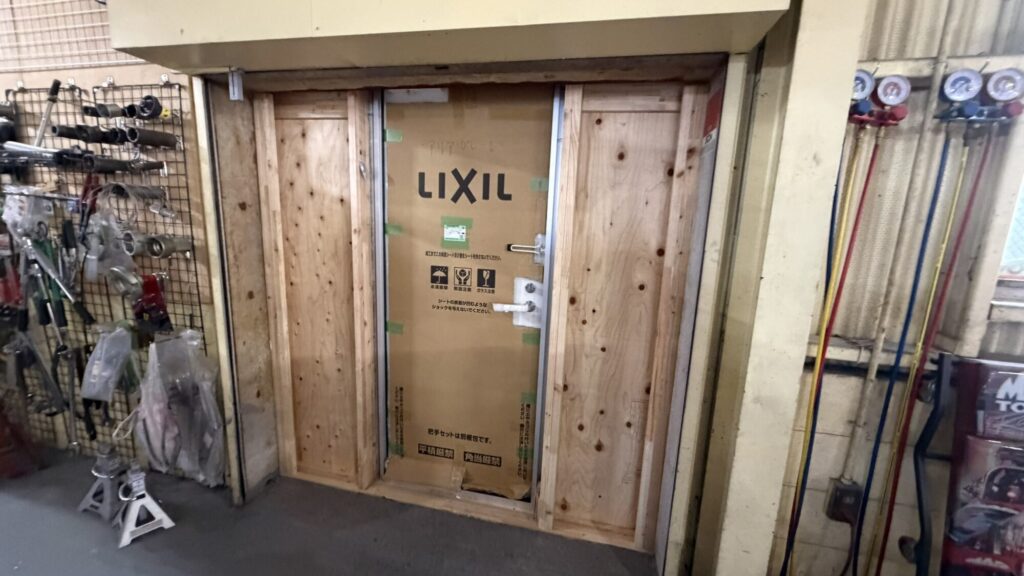 本日は倉庫に裏口用扉の新規設置工事を行いました。
